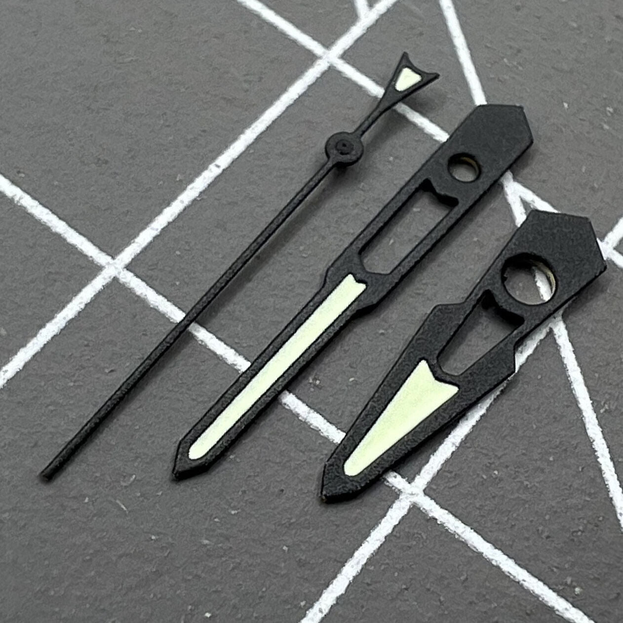 2 Sets/Pack mit 13 mm mattierten schwarzen Zeigern mit hohlem grünem Leuchtelement für NH35 NH36 Uhrwerke
