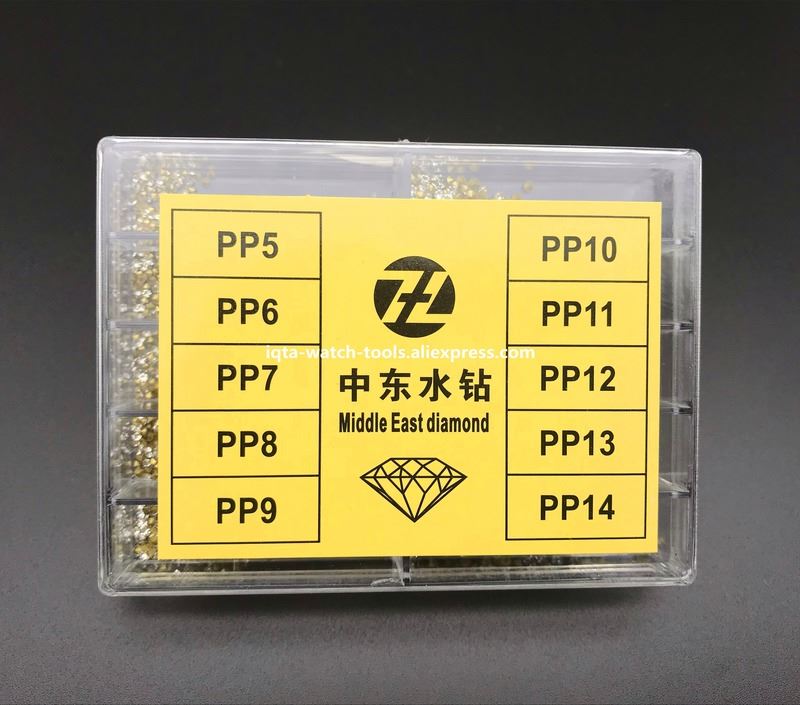 Item Description The Watch Rhinestone for replacement Material : Middle East Rhinestone Colour: Silver Shape: Round Contains 10 popular size : PP5, PP6, PP7, PP8, PP9, PP10, PP11, PP12, PP13, PP14 Pakage included: 1 x Assorted watch rhinestone in a plastic box
