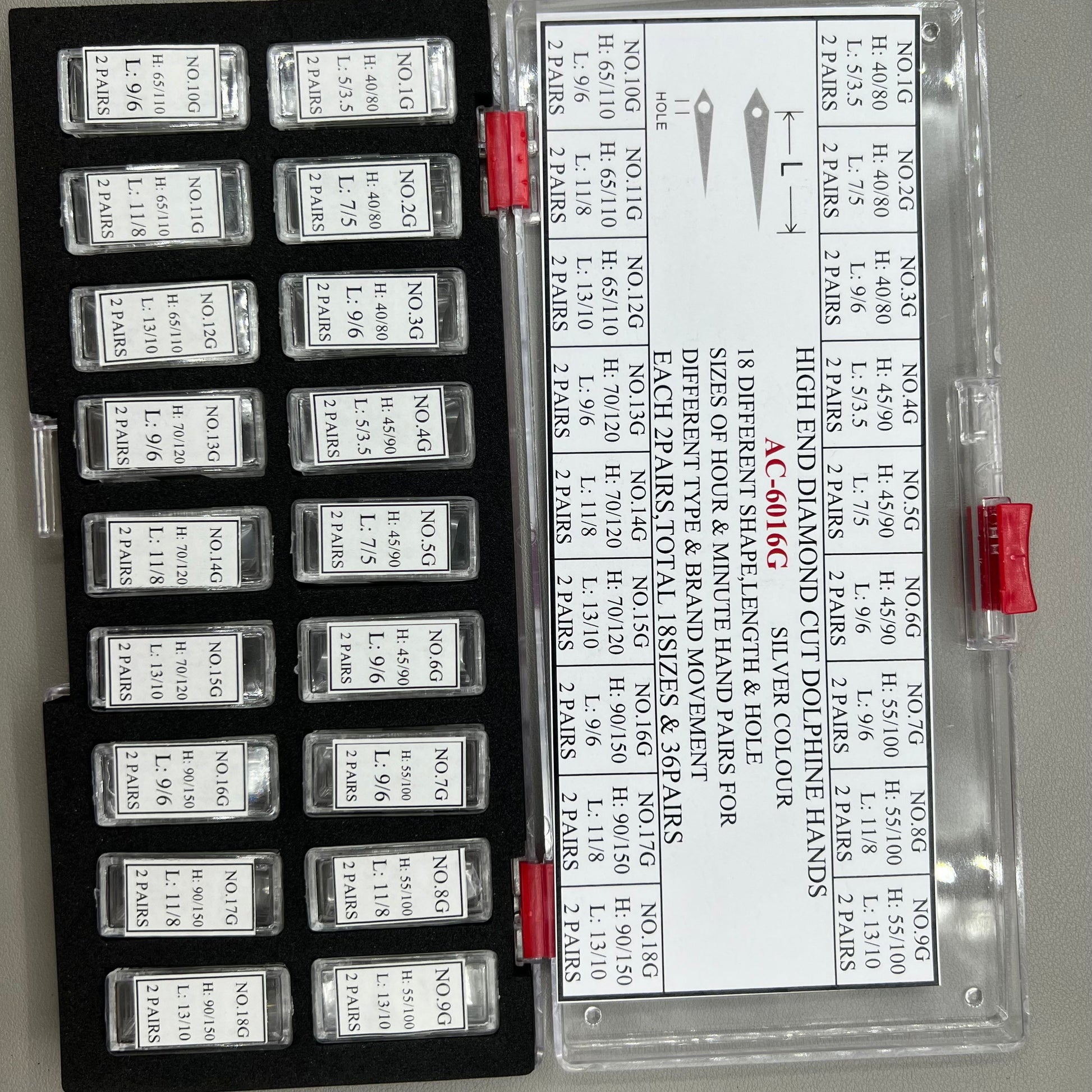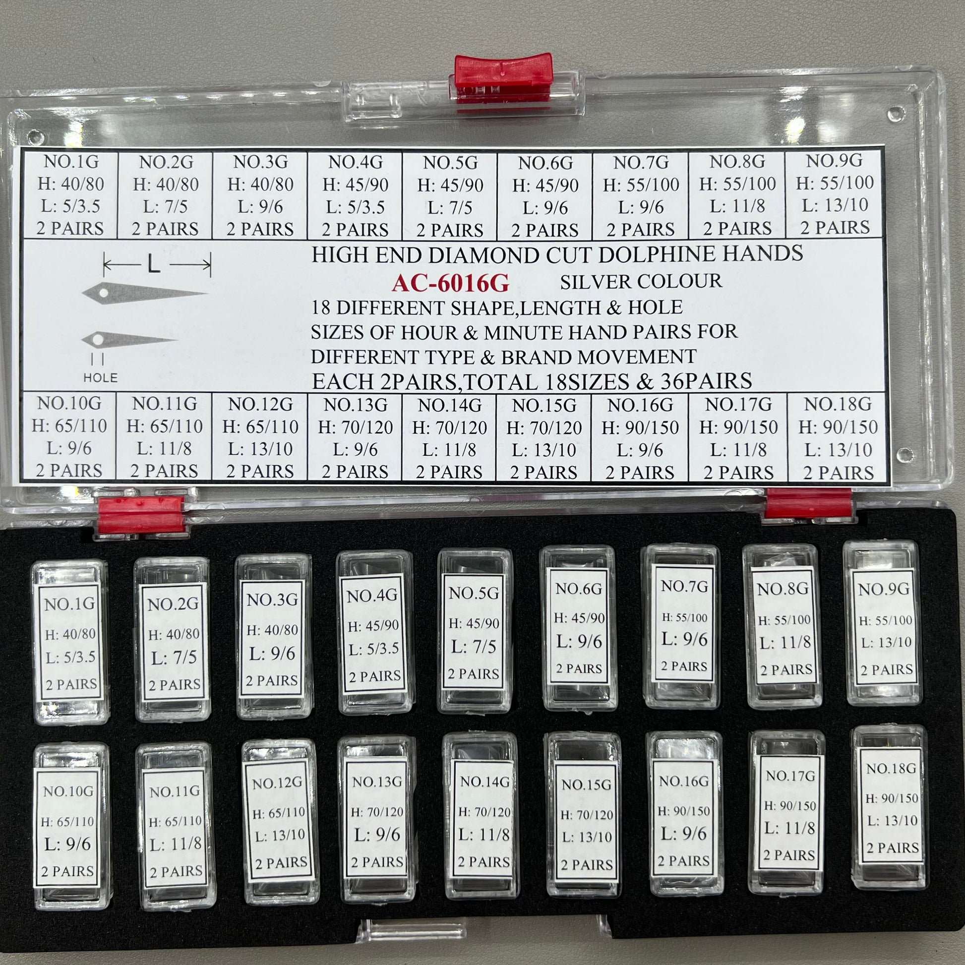 Größenpaare von Stunden- und Minutenzeigern für verschiedene Uhrenwerke und Marken